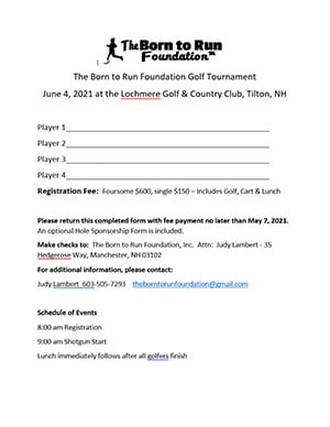 Born To Run Golf TournamentApril 15, 2021April 15, 2021Schedule of Events8:00am Registration9:00am Shotgun StartLUNCH IMMEDIATELY AFTER ALL GOLFERS FINISH Date And TimeJune 4, 20218:00 AM EDT Location360 Laconia Rd100 Everendon RoadTilton NH, 03276 Download Registration form below: